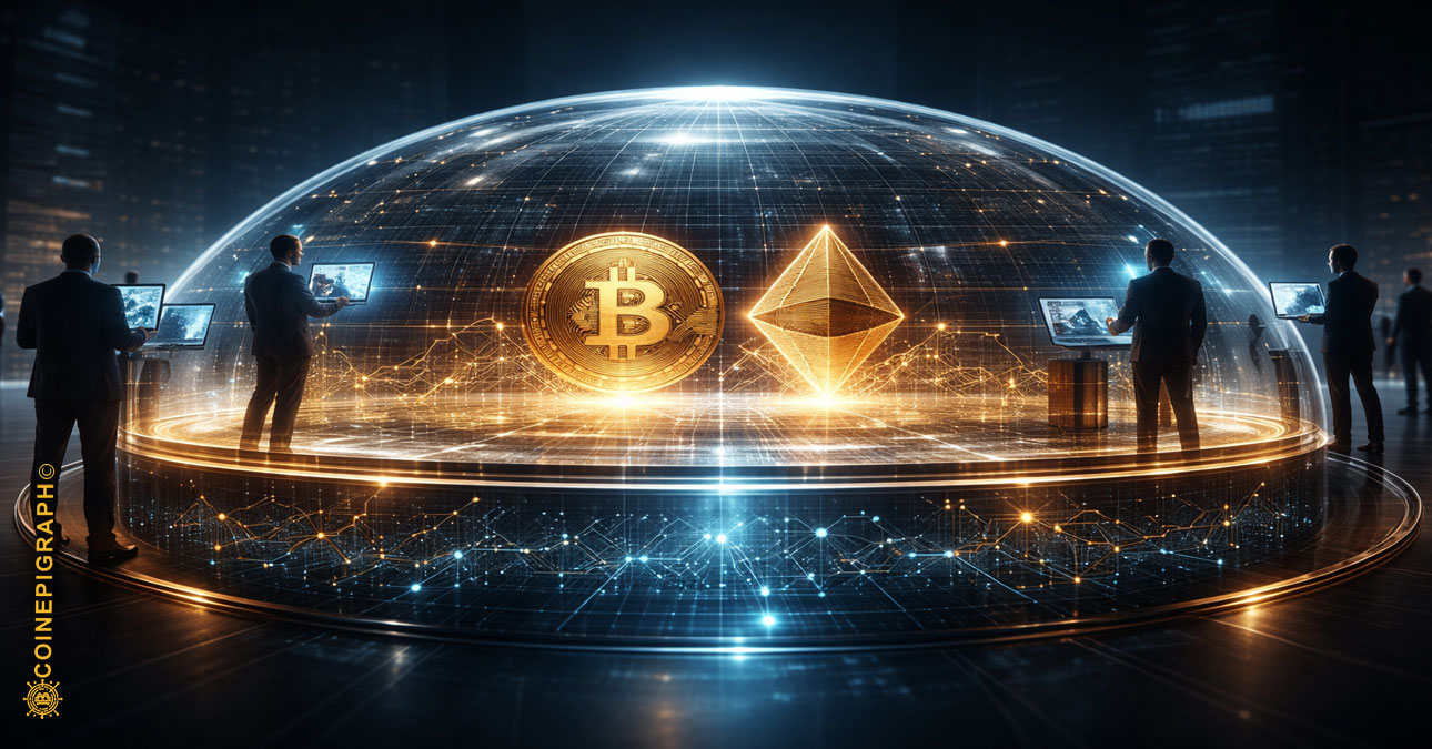 A cinematic financial scene showing a glowing Bitcoin and Ethereum network being wrapped inside a transparent institutional shell, with investors interacting only with the outer layer while the true blockchain activity remains beneath the surface; contrast between direct ownership below and controlled exposure above; subtle visual separation between real assets and financial representations; deep navy, black, and charcoal tones with luminous teal and gold highlights, ultra-realistic, cinematic lighting, no text